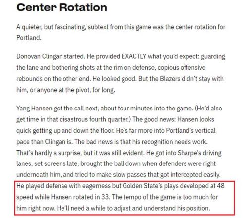 楊瀚森在首場(chǎng)季前賽表現(xiàn)不佳,他出戰(zhàn)21分鐘,5投2中,得到4分4籃板1助攻,出現(xiàn)4次失誤和6次犯規(guī)。開拓者跟隊(duì)記者戴夫·戴卡德撰文解析了開拓者的首場(chǎng)季前賽,其中包括中鋒輪換的片段,他指出楊瀚森跑動(dòng)速度其實(shí)并不慢,但是他的意識(shí)偏慢,也就是他的場(chǎng)上意識(shí)暫時(shí)還跟不上快節(jié)奏的NBA比賽。