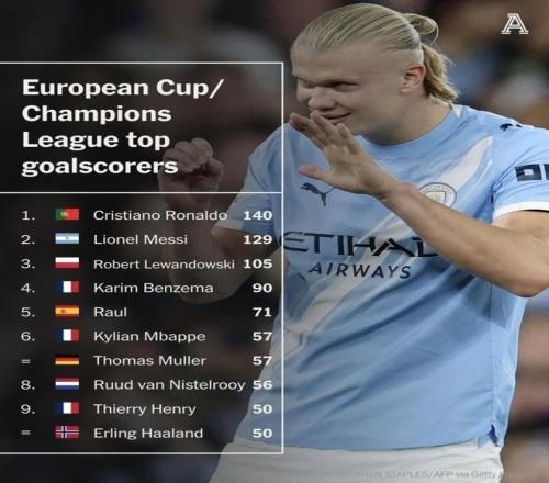 最快達成歐冠50球所用場次排名!梅西66場哈蘭德比梅西少用17場