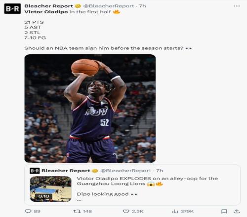就在他上半場(chǎng)拿到21分+完成單臂空接暴扣后,美國(guó)媒體BR寫道:有一支NBA球隊(duì)在新賽季正式開啟前有意簽下他嗎?(這個(gè)言論實(shí)際上算間接舉薦奧迪了,因?yàn)檫@個(gè)狀態(tài)真的比很多現(xiàn)役球員更好。)