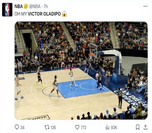 這場(chǎng)比賽奧拉迪波完成了一個(gè)單臂空接暴扣,他的頭險(xiǎn)些撞到籃筐,NBA官方都寫道:OH MY 奧迪(驚呼表情)。