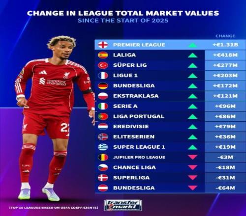 2025年歐洲15大聯(lián)賽身價(jià)漲跌榜:英超增加超13億歐元第一