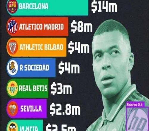 - 西甲各隊(duì)袖標(biāo)廣告收入:皇馬2500萬美元居首,巴薩第二